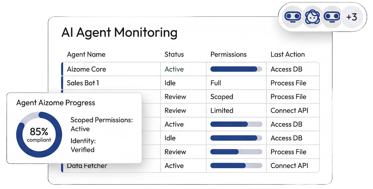 Real-time visibility into every agent action across your organization. Track usage, enforce policies, and generate board-ready compliance reports automatically.