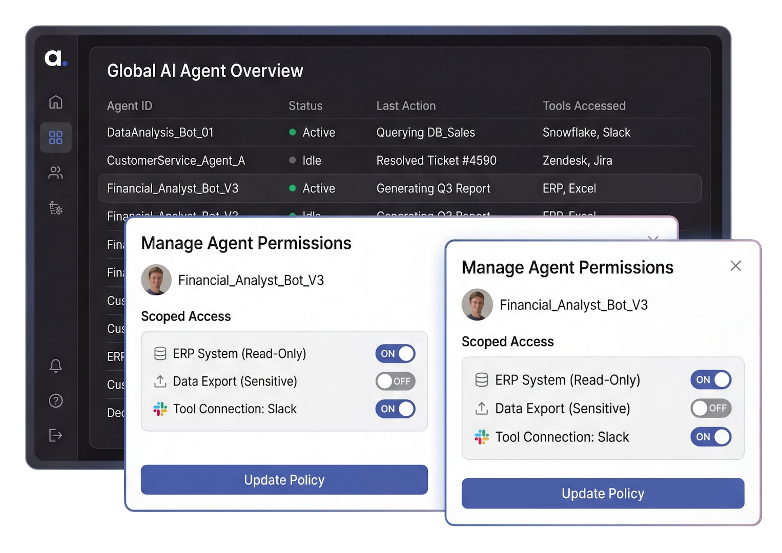 Stop relying on shared API keys. Every agent gets a unique identity and strictly scoped, policy-based permissions for every tool it touches.